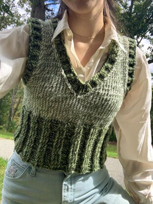 The Erudite Vest is a modern and trendy twist on a classic V-neck vest. It is worrked from the bottom up, and is a quick knit!