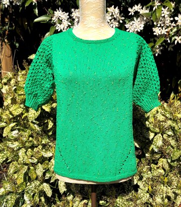 This lovely sweater has a real touch of retro flair. The slightly puffed sleeves are worked top down making it easy to change the length. And a "cats-eye" pattern is used which gives an enhanced eyelet stitch. This is then reflected in the slanting eyelets on the body. The main body is worked bottom up. Full written instructions.