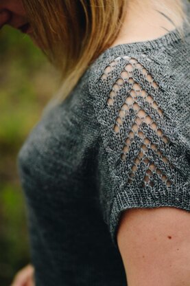 The pullover is worked seamlessly from top to bottom, beginning with the contiguous set-in sleeves method of shaping developed by Susie Myers. You will start working at back neck and increase stitches to shape lace shoulders. The back and front are worked flat, and once they are joined the body is worked in the round to be finished off with rounded hemline.