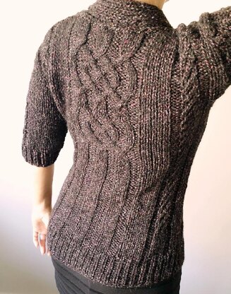 I have combined the elements of varied ribbing, a twisted stitch panel and a central braid to create a design that draws your attention. The yarn chosen also makes this a warm and cozy pullover.