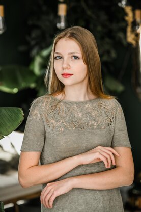 “Etera” top is worked seamlessly from the top down. The lace pattern of the circular yoke is repeated in the side lace panels which give the garment its A-line shape. The pattern contains two shaping options – with moderate A-line up to the hipline, and with a more pronounced A-line shape. For both versions, detailed row-by-row instructions are provided. Pattern instructions account for any sleeve length as well as for any garment length.