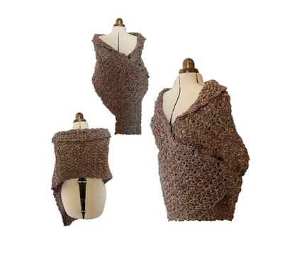 This is a simple rectangle panel wrap, crocheted back and forth In a scalloped shell style stitch. Although the garment is only given as one size, you could increase or decrease the foundation chain as much as you like to alter the length of the shawl, and work further rows if you’d like it to be deeper. The pattern is written with no charts, but I have included a diagram to show where buttons and button loops should be positioned.