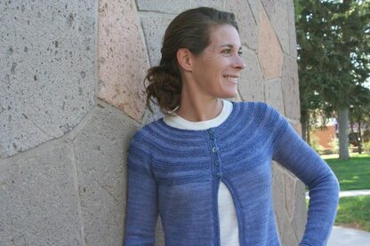 A simple, streamlined yoke-neck cardigan, constructed from the bottom hem up with a slightly A-line shape. The sweater is worked using coordinating laceweight and fingering weight yarns for a very light garment with a lot of drape. The body is worked back and forth to the armpits with decreases at the bottom garter-stitch stripes to taper the body slightly. The sleeves are then worked in the round, and then joined to the body at the yoke. The sweater is then shaped using decreases in the garter stitch stripes. It is finished with narrow garter-stitch front bands.