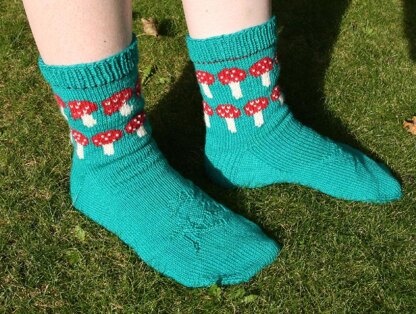 Worked toe-up using fingering-weight yarn, the socks have two stranded colourwork rings of toadstools on the legs, either or both of which can be beaded for extra fairy sparkle, and the shadow of the last fairy dancing across the top of the foot in reverse stocking stitch.