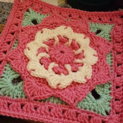 This beautiful square is made to look like what I imagine a fairy star would look like. It has basic simple stitches as well as a few back post stitches.
