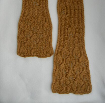 Lacy leaves float down the length of this scarf, against a twisted rib tree bark background, and gather in a gently flaring lower edge. Matching hat pattern is also available as a Ravelry PDF download. The lace design is charted on the pattern. If you don't like to read charts, and want a written-out version of the charts, let me know and I'll email you a copy.