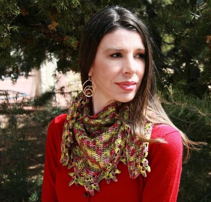 Worked from side to side this triangle shawlette is as fun to make as it is to wear. A leafy edging is applied to the border to add flair and movement. Crocheted in a fingering weight yarn, this shawl will be warm yet light, perfect for draping over your shoulders on a chilly night or for wrapping scarf-like around your neck under a coat.