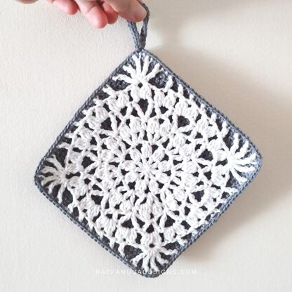 The Falling Petals Potholder is a classic and delicate crochet hot pad made by layering two granny squares. One square is a lace granny square with a flower motif, and the other is a classic solid crochet square.