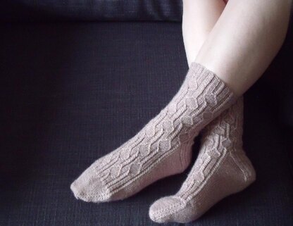 A series of cascading diamonds travel down twisted cables. The sock features an allover cable pattern and a patterned heel flap.