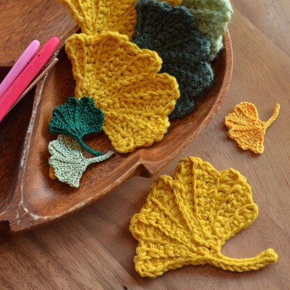 The fan-shaped ginkgo leaves start out green and change to beautiful yellow in the fall. Their delightful color and unique shape make the seasons more fun and dynamic. These crocheted leaves can be a great addition to seasonal decorations, such as an autumn garland.