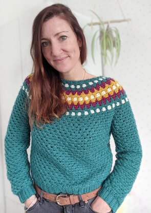 The Faraway Jumper is inspired by Fair Isle knitting and festive holiday jumpers, and features a striking circular yoke, which is worked in the round.