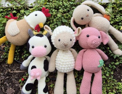 Complete set of 5 crochet amigurumi PATTERNS! Patterns include the list of suggested used yarns (Paintbox Yarns Simply Aran and Stylecraft Special Aran) Included patterns (sizes when seated): - Bunny - about 24 cm tall - Chicken - about 30 cm tall - Cow - about 27 cm tall - Pig - about 26 cm tall - Sheep - about 26 cm tall !! Sizes using Aran weight yarn and 5.00 mm crochet hook !! The patterns are written in English (US) using US terminology.