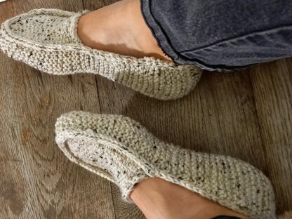 Farmhouse Slippers is the perfect knitted slipper pattern. This cozy slipper offers a cushioned sole and a comfy fit, with no weird seams anywhere. It is a fun knit, and makes a great gift! It is knit back to front, with no seaming at all. The finished edge adds enough tension to the opening so that it stays on the wearer's foot.