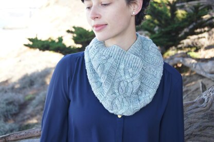 The Farryn Cowl is inspired by its own name which translates to “adventurous” in Irish Gaelic. Columns of garter stitch separate three beautiful and distinct cable patterns that repeat around the neck, bordered by twisted ribbing edges. Though the cables appear intricate, this pattern comes with both chart and written instructions to help guide you through the twists and turns. The Farryn Cowl is knit in one piece in the the round from bottom to top using a DK weight yarn and looks lovely knit in solid or semi-solid tones that accentuate the lovely cable work.