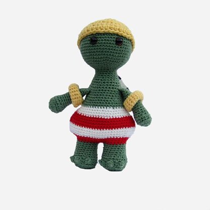 This pattern includes easy to follow instructions on how to make the beach turtle and his accessories, the floaties and bathing cap. It is worked bottom up with legs and arms joined as you go. The only sewing is to attach the turtle back! Floaties and bathing cap are removable.