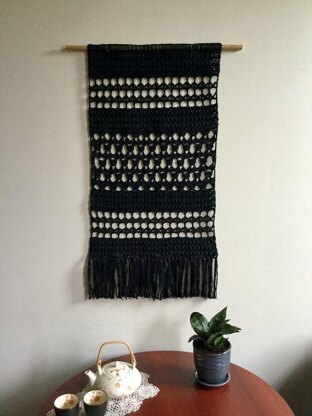 The pattern includes both the large and small wall hangings, and both use regular cotton dishcloth yarn. The large wall hanging uses four 100 gram balls of yarn, and the small uses one ball of 100 grams. They can be hung on a purchased dowel, but I used a stick from my yard for the mustard yellow one.