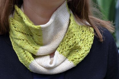 Notes: This is knit as a long tube in the round. After blocking, the ends are sewn together to form a loop. The sample was knit using Fiddle Knits Polka in Peridot (MC) and Pearl (CC), 183m / 200y in MC and 183m / 200y in CC.