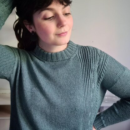 Techniques used : Bottom up drop shoulder sweater / Body worked straight in the round until the armholes / Front and Back worked flat separately / Shoulders shaped with German short rows and joined with a 3 needle bind-off / Sleeves picked up and worked in the round, tapered with simple decreases / Texture panel on the front left, width adjusted according to size / Twisted ribbing, Right and Left Twists, Simple 4 st cable / 2/2 ribbing / Folded collar / Pattern includes charted and written instructions