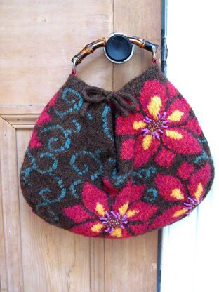 This is a generous sized felted bag that’s knitted in Jamieson & Smith’s 2 ply Jumperweight but **USED DOUBLED **throughout. The large scale florals are worked using the intarsia technique with bullion knots and beads worked at the centre of each flower. The swirling foliage is Swiss darned into the background after knitting and short row shaping is used to create the curved base . The beads and bullion knots are added after felting, you could add a lot more knots, use much bigger beads or even small buttons at the centres. Pattern instructions are a combination of written and charted