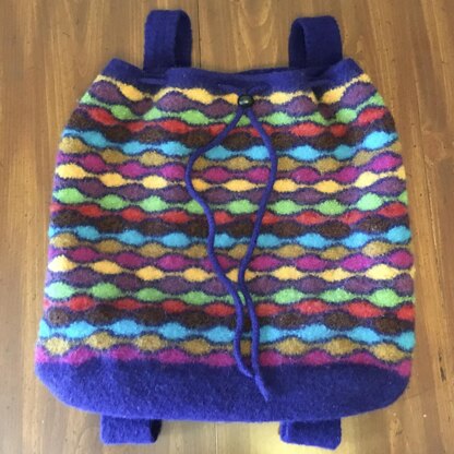 This bag is made from the bottom up on a circular needle, knit in a round. The base is made in garter stitch flat with stitches picked up all around the base. The sides of the bag are knit in a mogul pattern made by repeated short rows. It has a drawstring closure and backpack style straps.