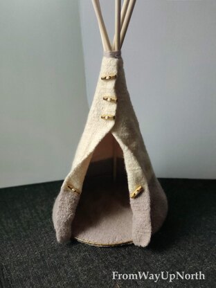 The felted teepee is a fun project to make for your small furry one! The teepee provides a comfortable, safe sleeping space; purfect for your kitty or small dog! This became an instant hit for our kitty - among a plethora of beds, he prefers the security of the teepee. I hope your furry one does as well! The inside diameter is 14 “ and the materials you’ll need include a 14” metal embroidery ring, 5 x 36” wooden dowels, a needle and thread, a drill with a tiny bit (to secure dowels) and 5 toggle buttons. A similar non-felted pattern is also available in my shop.