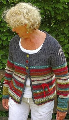 4 buttons by Jim Knopf (Germany), 2 buttons each in Red and Avocado. For embellishment: 6mm beads in Turquoise and Rust, and some Mini Satin Roses and a short length of velvet ribbon in vintage look. At some places the colors are different from right sleeve to left sleeve. Circular needles are required for this project even though it is worked flat. This is because you need the ability to slide stitches back across the needles and work the right side again. There's a written pattern as well as colored charts for front/back and right/left sleeve.