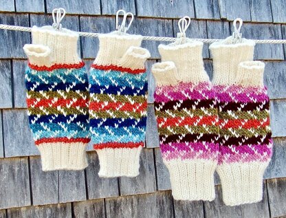 About The Design: Fingerless mitts are small, quick projects that can be knit year ‘round and saved up for holiday or winter birthday gifts. The design is sampled in Lamb’s Pride Worsted, which makes such a cozy fabric. The pattern offers 2 sizes and 3 colorways. The S-M pair has a purl ridge before and after the color pattern, to encase the pattern. The M-L pair is worked without the purl ridges, for a more flowing design – knitter’s choice!