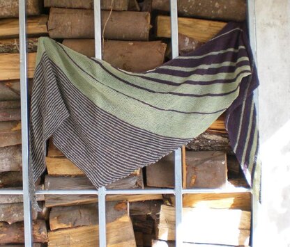 This shawl features a boomerang shape (also known as banana shape or heart shape). It is worked in simple garter stitch. The special effect is achieved with stripes in two colors, which vary in width according to the Fibonacci sequence. In other words, this shawl is started at the right corner and grows diagonally by using strategically placed in- and decreases. The stripes n the first color get smaller while those in the second color get wider. At the center of the shawl this sequence is reversed. Finally some small stripes are worked which also allow you to use up as much of your yarn as possible.