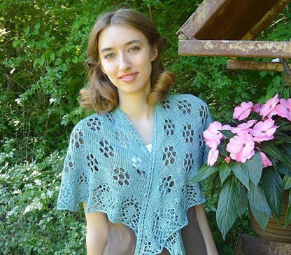 Pattern is worked from the center back to the edge using a modified triangular construction technique that stays on the shoulders better. Requires a basic understanding of lace knitting including double increases and decreases as well as ability to read lace charts. Suitable for intermediate knitters. Suitable for intermediate knitters.