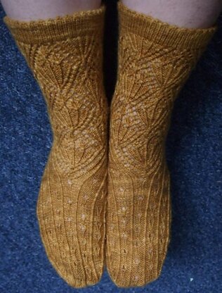 Inspired by the myths of King Arthur and designed to mimic heraldic pendants, these top-down socks are a challenging project but with elegant results, well worth the effort! They feature a picot cuff, ornate bell lace motif, heel flap and gusset decrease that is hidden in the design of the instep. Instructions are charted with written explanation for three sizes. This pattern is rated as advanced.