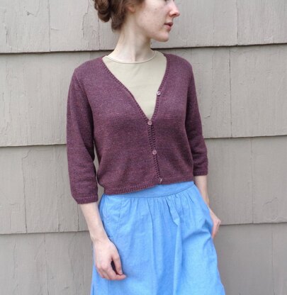 A cute, easy layering piece for 3 seasons, Fig is a relaxed cardigan with 3⁄4 length sleeves and a slightly cropped length. Ribbing at the hem adds a hint of waist shaping.