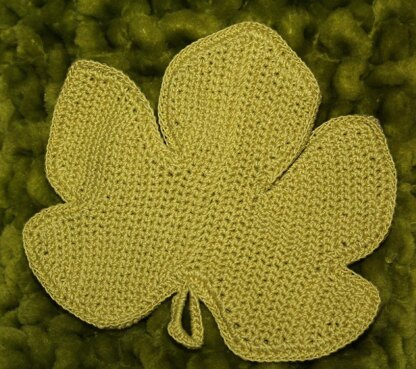 Make this fig leaf potholder for tropical kitchens or just to remind you of the tropics in the middle of winter. It's made with bright green size 3 crochet cotton. Two fig leaves are made and then crocheted together to make the potholder thick enough to protect hands and surfaces. Finished size is 7” x 8”.