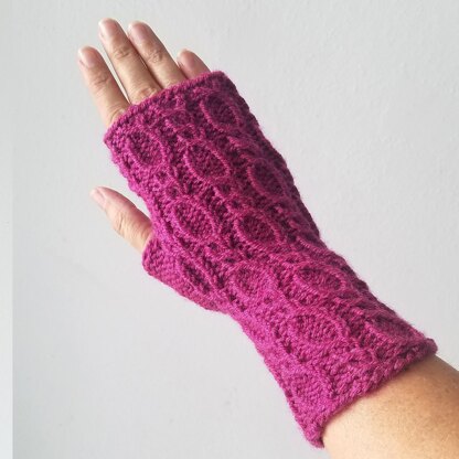 These fingerless gloves can use DK or light worsted weight yarn. Cables create a textured repeat.