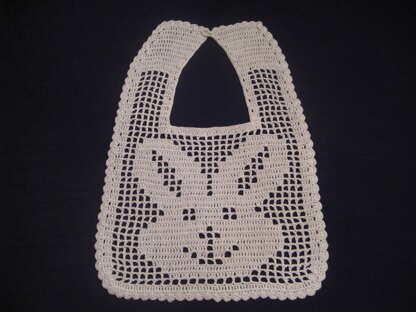 This is a beautiful bib which can be made in two ways. Charts have been provided for both filet crochet or regular bib with color work contrast for the bunny, or cross stitch overlay. The filet is done in size 10 crochet thread, while the color work is done in 100% worsted weight cotton.