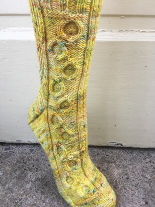 Pictured sock is size medium and was worked in Valhalla Farms Farmhouse Sock, Yellow Brick Road colorway.
