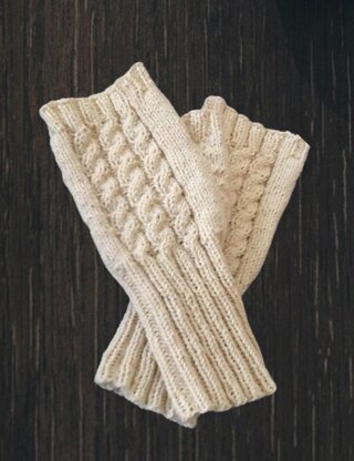 A knitting pattern of cabled mitts in two sizes. The mitts are knit at a fine gauge and feature a snug fit that feels like a second skin, yet are warm and practical for outdoor or indoor use. May be sized up for looser fit or for men’s sizes by using a slightly heavier yarn.