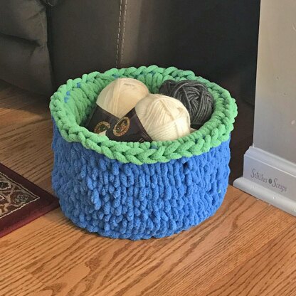 Learn how to knit without needles! This bright, finger knit basket pattern is fast and easy to make. It stands up tall with the help of some plastic canvas hidden between the layers.