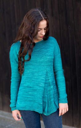 Slightly boxy at the top and with short-row shaped overcast shoulders, this pullover in A-line silhouette has a closer fit around the bust while flaring out towards the bottom in a casual way, culminating in a most nonchalant asymmetric pleat.