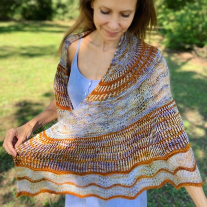 Fiori Shawl is a half circle shawl with a lot of different stitch patterns. Brioche stitch combined with lace sections knitted with delicate Mohair Silk yarn and garter stitch rows.