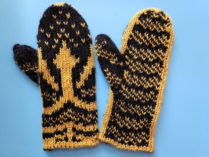This is a pattern for double-knit oven mittens using a Japanese kanji character “火 (Fire)” as a motif. The character is a pictographic representation of a fire. I added other elements of fires around the character, such as sparks. The design on the cuff area is reminiscent of an item used by Japanese firefighters in the Edo period, called Matoi. Matoi was used to identify different groups of fierfighters, and each group had an intricate Matoi design to raise fighters’ morale.