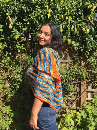This asymmetrical triangular shawl is a lovely easy knit, with no counting and no purling, and can be made into any colour combinations that take your fancy! The easy 8-rows pattern makes for a relaxing knit, with the added fun of the dropped stitches, the perfect design effect to showcase all the beautiful colours of hand dyed yarns, and the varying kinds of dropped stitches form the elegant undulating pattern for a truly captivating shawl... The contrast of the wavy blue waters bands and the fiery glow of the Garter Stitch bands make for a striking and eye-catching beautiful shawl, perfect for summer, and bright and cheery during the winter!