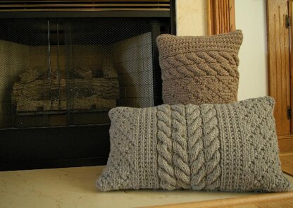 These wonderfully chunky pillows take three standard Aran stitches and play with the order they are worked across each pillow. What a difference this order makes to the look and feel of each – one has a “typical” Guernsey look with a center panel flanked by cables and a broken rib stitch, while the other clusters those same cables in the center with the panel broken up and edged with the rib on both sides. These pillows are fast and cozy – a great project for the knitter’s home!