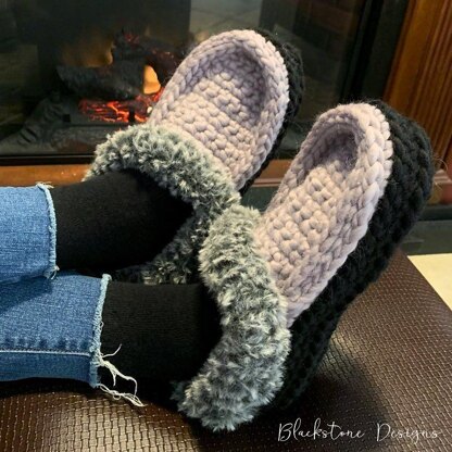 These slippers mimic the popular moccasin shoes! They have a low ankle and fur cuffs. They are so comfortable, they make great house shoes!