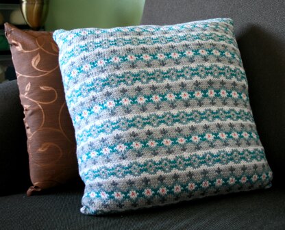 Evoking the natural rhythm of a "firth", an inlet or bay, the fair isle pattern employed by this cushion will relax and impress anyone who views it. Knit in a palette of gorgeous blues, a pop of an alternate color is knitted with a third strand, or added later by duplicate stitch. Take it on a picnic or add it to the decor of your home. The Firth Wave Cushion will add drama and interest to any occasion.