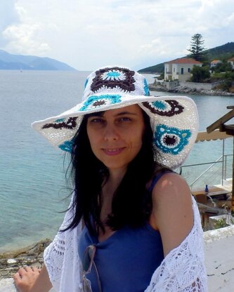 I once saw a hat similar to this one, but without any instructions or a diagram. As I was determined to have a piece of accessory like that in my possession, I put a lot of thought into making it, and eventually gave it a try. It turned out very, very pretty and completely unique. The hat is made from 10 square motifs, 4 of which make up the crown of the hat, and 6 make up the brim. After the 4 crown motifs are assembled together, the top is worked in the rounds from the outside edge towards the center. Another option is to separately crochet the top, starting from the center, and join it to the crown. The brim is made up from 6 square motifs, and the spaces between them are filled in by crocheting extra rows in the angles between them. After completing it, the hat is starched with a sugar and water mix by spraying it all over, and left to dry.