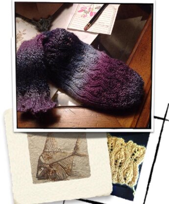 FishFossilsToe-upSock has lacework on instep and around leg, a faux heel flap worked in either honeycomb pattern done with or without cable needle or knit-slip ribbing. Additional options include tapered or rounded toe, generic or calculated foot length, and Russian or picot bind off. References are provided for most techniques.