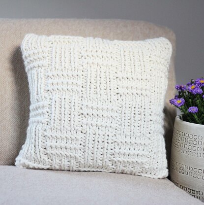 Fisherman's pillow cover is knit up in super chunky yarn in textured pattern.