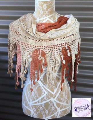 This is a fun shawl to work up and watch grow. It incorporates Filet work with small clovers hanging at the ends. These are staggered to give a unique look.