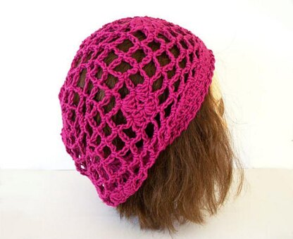 a lace slouch hat using chain mesh, a flower motif, diamond shapes, and crab stitch edging