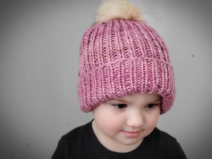 You will be holding 3 strands of fingering weight yarn together in the ribbed beanie to make a hat that will fit pretty well every member of the family. Pictures shown here are the same hat on an 18 month old and a ... 30 something year old! Size 5.5mm(US8) and 6 mm (US 10) in your preferred method for knitting in the round.